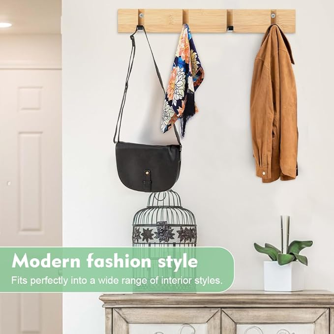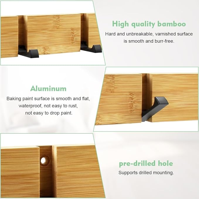 يمكن أن يكون رف المعاطف الخشبي عمليًا وأنيقًا. إذا كنت تبحث عن نموذج أنيق، فهذا هو النموذج الذي تحتاجه. علاقة معاطف بسيطة مثبتة على الحائط: تصميم أنيق من خشب الخيزران مع خطافات من الألومنيوم الأسود، مثالية لإطلالة عصرية وأنيقة. يمكن أن يتناسب بسهولة مع قاعة المدخل أو الحمام أو المطبخ أو غرفة النوم.
